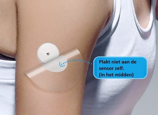 Ga bij het aanbrengen van de Freestyle Libre sensor al zorgvuldig te werk: onthaar eventueel je bovenarm, ontvet/reinig de huid met een alcoholdoekje en breng de sensor aan op een vlak stuk huid, wacht met aanbrengen tot de huid droog is. Als de sensor is aangebracht kun je de beschermpleister aanbrengen, doe dit het beste met hulp van iemand anders. In het midden plakt de pleister niet, zorg dat dit stuk boven sensor komt en haal alvast de middelste van de 3 beschermfolies aan de achterkant los, zodat je de pleister beter op de goede plek kunt houden. Daarna haal je telkens 1 folie extra los om de pleister verder vast te plakken totdat de gehele pleister rond de sensor geplaatst is. Als je dit gedaan hebt dan haal je de bescherming aan de voorkant los vanaf de blauwe strip (2x). Wrijf daarna de pleister nog beter en vlakker vast op je arm. De pleister gaat zich de aankomende uren nog beter hechten, wacht dus nog een tijdje met extreme inspanning of zwemmen en douchen.