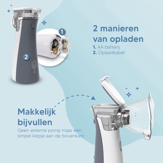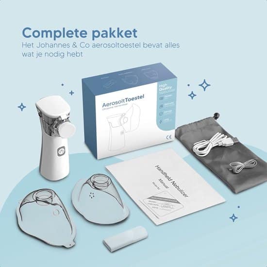 De vernevelaar komt met 3 verschillende mondstukken. Een voor volwassene, een voor kinderen en baby’s en een handig mondstuk! Hierdoor hoef jij geen meerdere onderdelen te kopen of andere vernevelaren. Je ontvangt van ons het complete pakket!