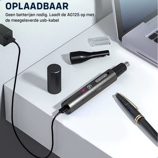 De AG125 kan eenvoudig opgeladen worden middels de meegeleverde USB-kabel. Zo kunt u de adapter van uw telefoon gebruiken om de neustrimmer via het stopcontact op te laden. Ook kunt u het artikel opladen via bijvoorbeeld de laptop. Zodra het artikel wordt opgeladen zal er een rood indicatielampje branden. Deze zal ten allen tijden branden als de oplader verbinding maakt met het artikel. Laadt het artikel op wanneer deze op is en leg deze ten minste 4 uur aan de lader. Let op: een adapter wordt niet mee geleverd, enkel de USB-kabel.