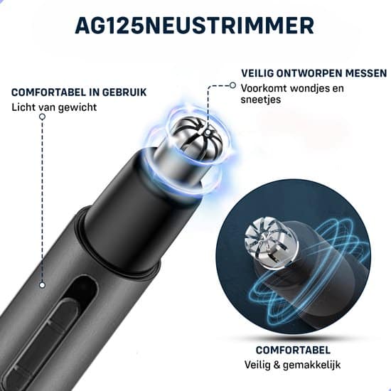 Verwijder gemakkelijk je neushaar met de AG125 Neustrimmer en zorg voor een frisse en verzorgde look. Wel nuttig, maar helaas niet zo charmant: neushaar. Soms groeit dit haar wat te lang of is er teveel neushaar aanwezig in de neusholten, waardoor het zichtbaar wordt. Veel mannen en vrouwen vinden dit vervelend en willen daarom het overtollige haar verwijderen. Dat kun je doen met deze AG125 Neustrimmer. De AG125 is tegelijkertijd ook een oortrimmer en wenkbrauwtrimmer. Niet goed? Geld terug garantie!