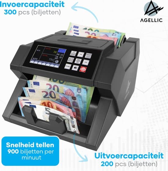 De Agellic biljettelmachine is dé oplossing voor iedereen die snel en efficiënt biljetten wil tellen. Met een telsnelheid van 900 biljetten per minuut en een optelfunctie die de totale waarde van de ingevoerde biljetten kan berekenen, bespaar je tijd en energie. Daarnaast kun je met de sorteerfunctie een x aantal biljetten van een bepaald soort sorteren en is de machine in staat om vals geld te detecteren dankzij de UV, MG, IR, MT, 3D en kleur detectie. De CE certificering garandeert dat de machine voldoet aan alle veiligheids- en gezondheidsnormen. De Agellic biljettelmachine is de perfecte tool voor iedereen die werkt met cash.