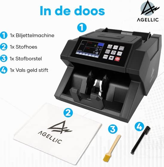 Bij aanschaf van onze Agellic biljettelmachine ontvang je gratis een valsgeldstift, een schoonmaakborsteltje en een stofhoes. Hiermee kun je ervoor zorgen dat de geldtelmachine goed onderhouden wordt en dat deze nog langer mee gaat. Kortom, onze geldtemachine biljetten is de perfecte oplossing.