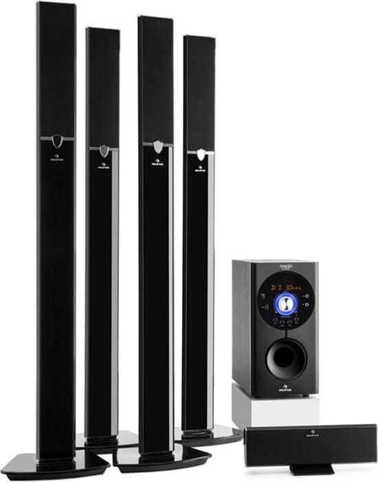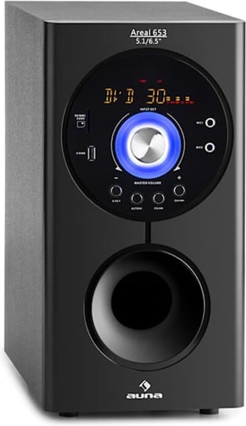 Deze Areal 653 5.1-kanaals-luidsprekerset is een homecinema surround-systeem. Hij heeft een subwoofer die 5 satelliet-luidsprekers aanstuurt met een totaalgeluid van 5 x 15 watt en 1 x 70 watt RMS vermogen. Je kan hem gebruiken door middel van een MP3-speler, een USB-stick, via bluetooth en via een AUX-kabel. De luidspreker zijn via bedrading verbonden en je kan de menu’s en geluidsinstellingen gemakkelijk aanpassen met een afstandsbediening. De set heeft een zwart en strak design en is voorzien van sokkels.