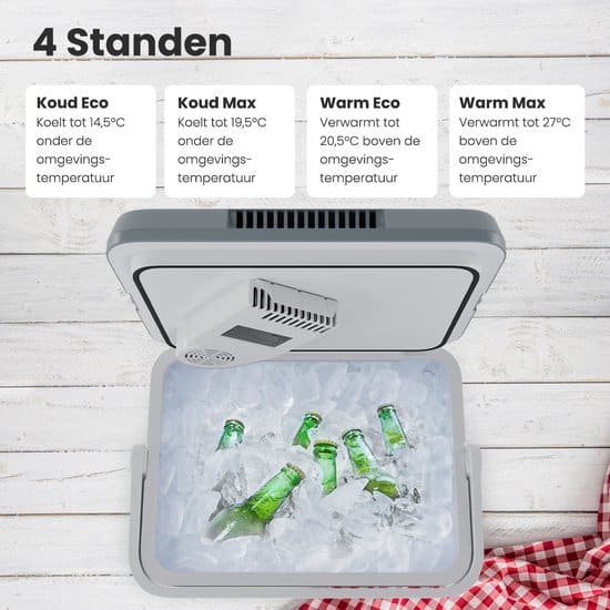 - Eco:Deze stand is ideaal als je wilt besparen op stroomverbruik. In deze stand verbruikt de koelbox slechts 8 watt en werkt de box bijna geruisloos.