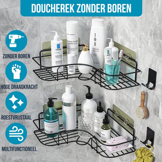 Wil jij jouw douchespullen netjes opbergen zonder gaten in de muur? Dan is een zelfklevend badkamerrek perfect voor in jouw douche! Onze doucherek set is bevestigd binnen 1 minuut, bevat een handige rand, wat zorgt voor extra gemak omdat je flessen niet kunnen omvallen en biedt genoeg ruimte voor al jouw bad spullen. Met sterk RVS materiaal en een draagkracht van 10 kg staat jouw nieuwe en stijlvolle badkamerrek stevig, zonder boor of schroef.