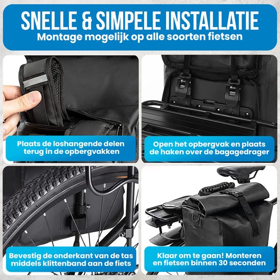 Naast dat de fietstas geschikt is voor nagenoeg elke fiets, is hij ook gemakkelijk te installeren. Stel de breedte in van het verstelbare ophangsysteem zodat hij perfect op jouw bagagedrager past en hang de tas vervolgens met de haken vast. Zet hem extra vast met het klittenband. Wil je de tas als schoudertas dragen? Haal de schouderband uit de tas en je bent klaar. Liever toch als rugzak gebruiken? Ook deze hengsels tover je snel uit de tas.