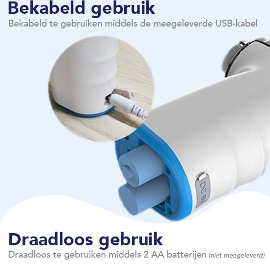 Je kunt de vernevelaar gebruiken door middel van batterijen of gebruiken door de meegeleverde USB-kabel aan te sluiten. De batterijen zorgen ervoor dat de vernevelaar mobiel is en dat je hem overal mee naartoe kunt nemen.