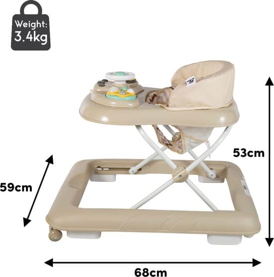 De loopstoel is geschikt voor kinderen van 6 tot 18 maanden oud, met een maximaal gewicht van 15 kg. De loopstoel heeft een afmeting van 68 x 59 x 53 cm.