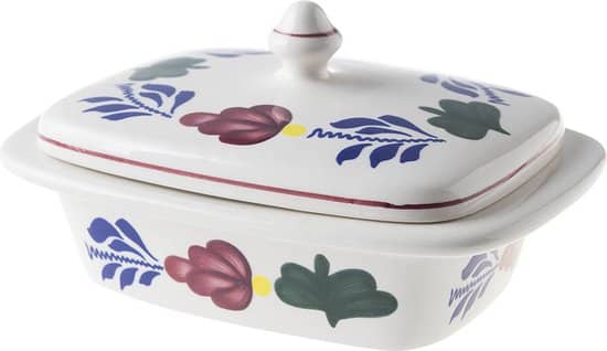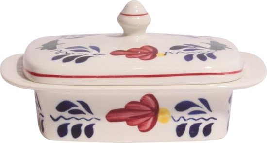 De ouderwetse botervloot mag niet ontbreken op de ontbijt- of lunchtafel. De botervloot is onderdeel van het tijdloze Boerenbont servies. Al ruim 175 jaar het meest bekende servies van Nederland met het oer-Hollandse bloemen decor in de kleuren blauw, groen, rood en geel. Van generatie op generatie is Boerenbont hét servies op tafel bij vele gezinnen. Op de deksel en aan de zijkant van de botervloot vind je het gezellige Boerenbont decor. De Boerenbont botervloot is 17,5x12cm en daarmee geschikt voor elk gemiddeld stuk boter.