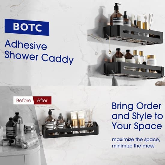 BOTC badkamer organizer is uitgerust met 2 ultra-krachtige kleefbanden, elk in staat om tot 12 pond te houden, dat is betrouwbaarder dan de douche caddy met zuignappen! Plak ze gewoon op elk glad doucheoppervlak en ze blijven zitten zonder boren of gereedschap. Bovendien kun je de muurvriendelijke kleefband gemakkelijk verwijderen met een haardroger.