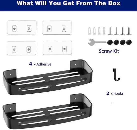 2 doucheplanken, 2 verwijderbare haken, 4 rugstickers. Kan je ook helpen je badkamerbenodigdheden beter te organiseren.
