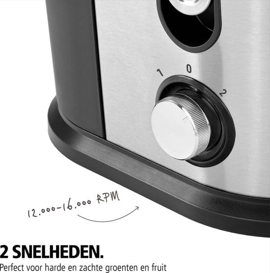 Door zijn hoge vermogen van 500 watt pers je met deze sapcentrifuge in een handomdraai lekkere en gezonde fruit- en groentesappen. Kies uit twee verschillende snelheden om het fruit en de groenten te snijden, en wacht tot je sap vanzelf de sapkan in vloeit. De snelheid wijzig je met de draaiknop aan de zijkant van de sapcentrifuge De krachtige RVS messen zijn bovendien geschikt voor harde groenten en fruit, zoals wortels. Zo geniet je op de meest snelle manier van de heerlijkste sappen.