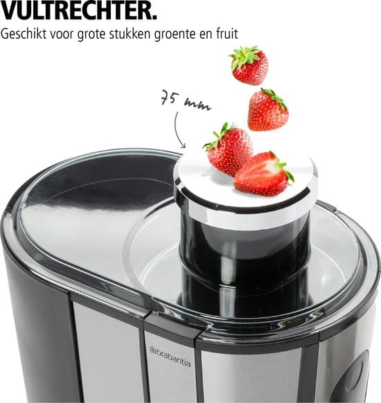 De vulopening van de sapcentrifuge heeft een diameter van wel 75 mm. Hierdoor passen er grote stukken groente en fruit in de sapcentrifuge, en hoef je van tevoren weinig voor te bereiden of te snijden. Sommige stukken fruit en groenten zullen er zelfs in zijn geheel inpassen, waardoor je helemaal geen voorbereiding hebt!