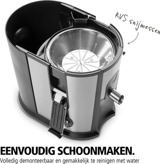 De sapcentrifuge is snel uit elkaar te halen en de aparte onderdelen zijn zeer gemakkelijk schoon te maken met water en zeep. Hierdoor heb je deze na gebruik weer snel opgeborgen.