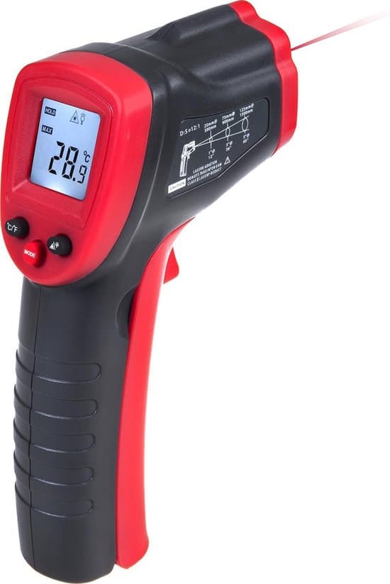 De infraroodthermometer meet de oppervlaktetemperatuur van objecten. Ideaal als we een bepaald object niet kunnen aanraken, bijvoorbeeld gevaarlijke objecten, met hoge temperaturen of moeilijk bereikbare objecten.