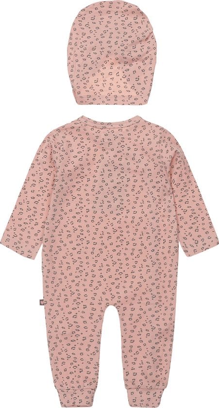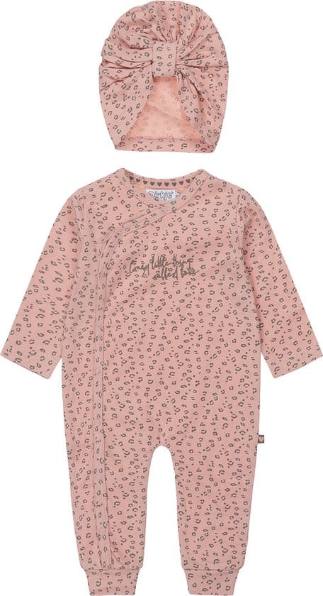 Cuteness overload! Een mooi roze meisjes boxpakje van Dirkje met subtiele all-over panterprint. Het babypakje heeft drukknoopjes en fijne boordjes aan de pijp, op de borst staat een tekst bedrukt. De set wordt afgemaakt met een schattig tulband mutsje!