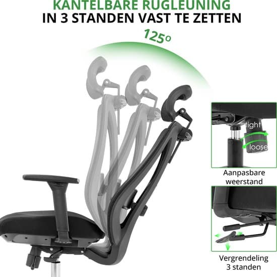 De ergonomische bureaustoel is voorzien van een extra dik zitvlak, waardoor je altijd zeer comfortabel in de stoel kunt zitten. Daarnaast is de bureaustoel voorzien van 3D armsteunen, een 2D hoofdsteun en een 2D lendesteun die de stoel nóg comfortabeler maken. Verder kun je de 125˚ kantelbare rugsteun in 3 standen vastzetten, net wat jij lekker vindt zitten.