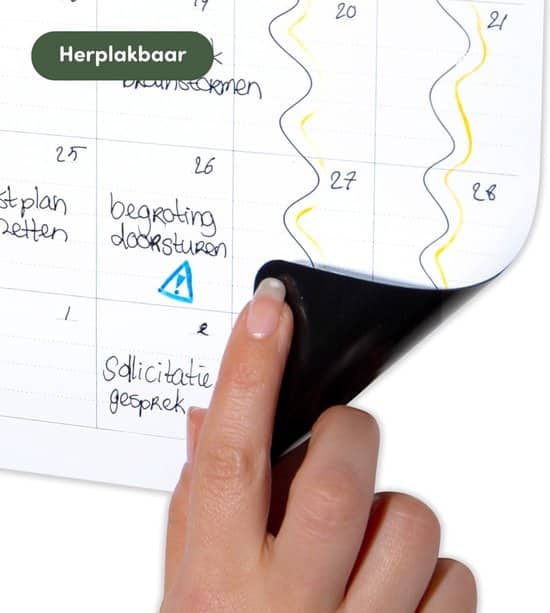 Dankzij de handige herplakbare kleeflaag aan de achterkant van de sticky whiteboard maandplanner, is het bevestigen zeer eenvoudig. Zo kun je de planner aanbrengen op gladde, vlakke en niet-poreuze oppervlakken, zoals een keukenkastje, een deur of zelfs op je bureau.