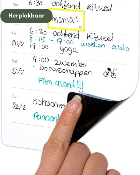 Het weekplanner whiteboard is zeer eenvoudig te bevestigen. Dankzij de kleeflaag aan de achterkant kun je het gemakkelijk aan diverse oppervlakken in huis bevestigen, of het nu de keuken, de hal of de werkkamer is. Hierdoor biedt het planbord extra flexibiliteit en is het gemakkelijk in verschillende ruimtes te gebruiken, zonder sporen achter te laten. Zo kun je op elke gewenste plek een handig overzicht van je planning creëren!