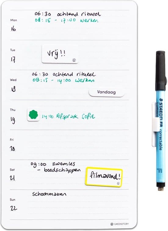 Op zoek naar een herplakbaar planbord die je op verschillende plekken in huis kunt gebruiken? Of mis je vaak belangrijke afspraken, taken of activiteiten die op korte termijn op de agenda staan? Dan is het GreenStory planbord week perfect voor jou! Met deze weekplanner hoef je je geen zorgen meer te maken over gemiste deadlines of vergeten evenementen. Dit handige planbord is namelijk speciaal ontworpen om je week duidelijk en overzichtelijk te organiseren. Of je nu een drukke professional, student met strakke deadlines of een ouder met verschillende gezinsactiviteiten bent, de whiteboard weekplanner biedt een praktisch en flexibel systeem om je planning geordend te houden.