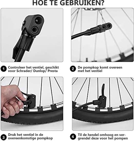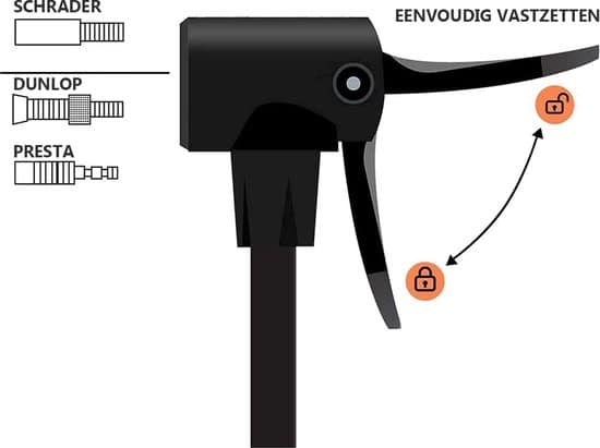Met de handige pompkop kun je alle banden met alle soorten ventielen oppompen. Voor de Schrader en Presta ventielen, ook wel bekend als het Franse ventiel, gebruik je het kleine gat. Voor het Hollandse ventiel gebruik je het grote gat. Met het lock systeem zet je eenvoudig de ventielkop vast aan het ventiel. Deze zal hierdoor niet telkens losschieten en kun je eenvoudig je band oppompen.