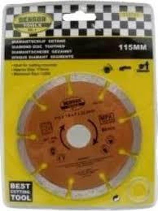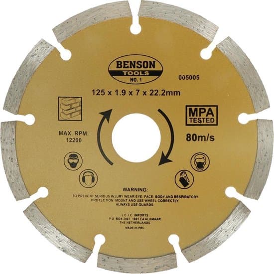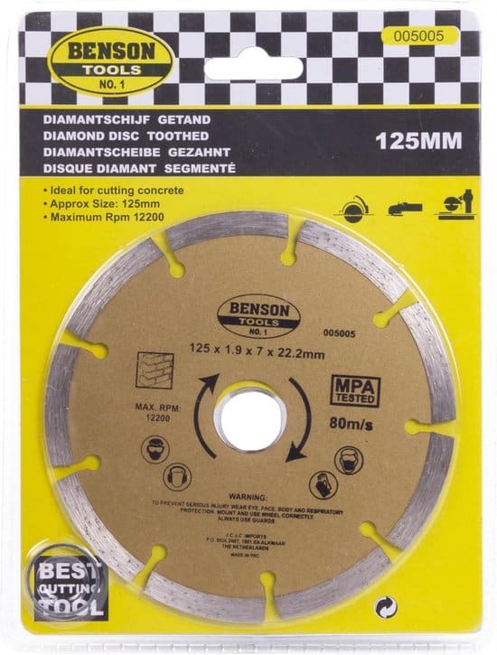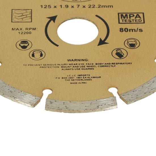 Diamantzaagblad met een afmeting van 125 mm geschikt voor afwisselend droog zagen in zachte en middelharde beton en steensoorten. Te gebruiken in combinatie met een slijpmachine.