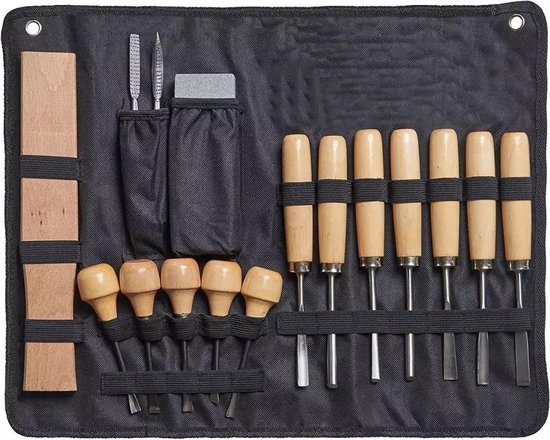 Deze 16 delige houtbewerking set bevat allerlei gereedschappen (zoals houtbeitels van verschillende vormen en slijpsteen) die je nodig hebt tijdens het houtbewerken! Het is geschikt voor zowel beginners als gevorderden. Houten handvat met metalen verstevigingsring en stalen mesjes. Het beukenhouten handvat zorgt voor een comfortabele grip. Het wordt ook geleverd in een handige opbergtas!