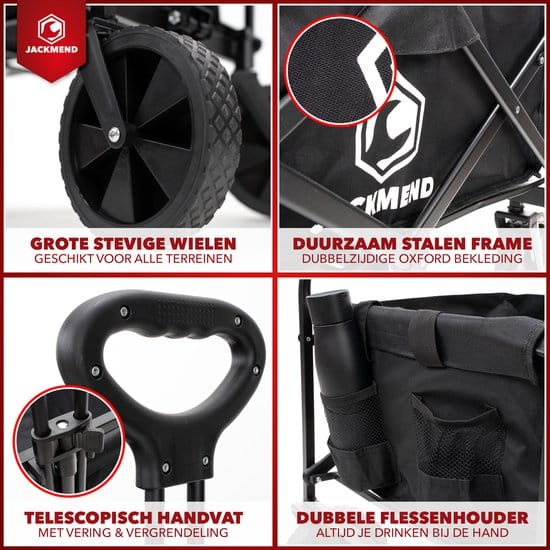 De JACKMEND bolderkar is niet alleen veelzijdig, maar ook een must-have in elk huishouden. Of je nu gaat kamperen, je huisdier meeneemt voor een wandeling, een dagje met de kinderen op pad gaat naar het strand, dierentuin of gewoon de speeltuin, klusmaterialen naar afgelegen plekken vervoert, festivals afgaat, je boodschappen doet met stijl, of gewoon een dagje eropuit trekt, deze bolderkar is dé alles-in-één oplossing!