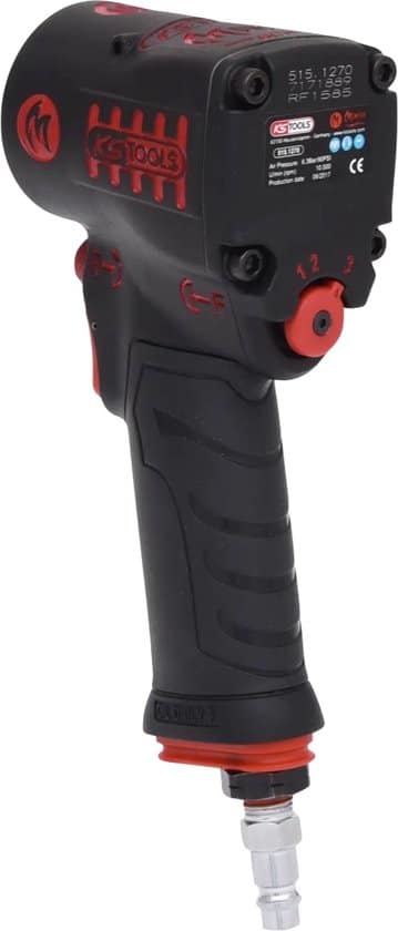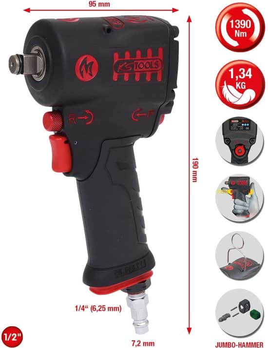 Presentatie: Mini slagmoersleutel KS TOOLS MONSTER mini 1390Nm – 190mm – 515.1270, Ideaal in de automotive sector en voor garagehouders. Hij kan gemakkelijk met één hand worden gebruikt. Voordelen: Mini formaat Bediening met één hand Ideale sleutel voor garagehouders Kenmerken: Totale lengte: 190 mm Hoogte: 90,5 mm Maximaal aanhaalmoment: 1 = 270 Nm – 2 = 640 Nm – 3 = 965 Nm Maximaal losdraaimoment: 1390 Nm Onbelast toerental: 10000 rpm Minimum slangdiameter : 3/8″ – 10 mm Gewicht : 1,34 Kg Verpakking: 1x Mini slagmoersleutel KS TOOLS MONSTER mini 1390Nm – 190mm – 515.1270 Geleverd in de originele verpakking Garantie: 1 jaar garantie