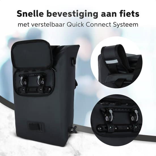 - Drie draagmanieren: De belangrijkste functie van een tas is het vervoeren van jouw spullen. Wij hebben je dit om deze reden zo makkelijk mogelijk gemaakt. De rug- en schoudertas fungeert namelijk ook als fietstas. Met een eenvoudig kliksysteem maak je de tas vast aan je bagagedrager.
