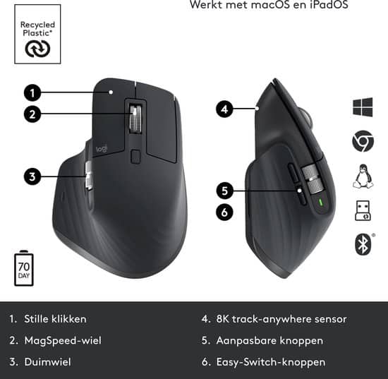 - Multi-Device en Multi-OS – Verbind de comfortabele muis met maximaal 3 apparaten via Bluetooth of de meegeleverde Logi Bolt USB-ontvanger (6) op Windows, macOS, Chrome OS of Linux