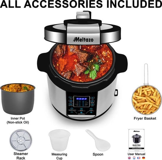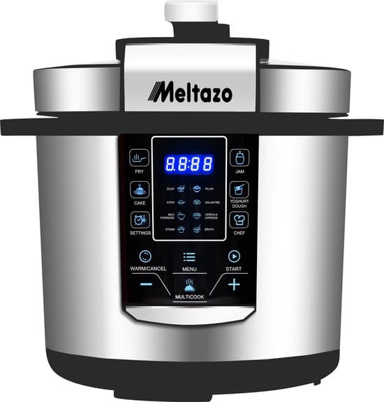 — MELTAZO® multifunctionele snelkookpan is een nieuw soort kooktoestel dat beschikt over de nieuwste technologie en alle voordelen van snelkookpannen, rijstkokers en kookpannen combineert. Deze multicooker is met een inhoud van 6 liter ruim voldoende om maaltijden voor het hele gezin te bereiden. U hebt alles wat u nodig hebt in 1 apparaat, dus kook uw favoriete maaltijden met één druk op de knop. De temperatuur en druk worden geregeld door het gebruik van geavanceerde modellen. Het is veilig, gebruiksvriendelijk, energiezuinig, betrouwbaar en ideaal voor het bereiden van voedzame maaltijden. Het heeft 14 aanpasbare multifunctionele kookprogramma’s, zodat u praktisch elk recept kunt bereiden. Het heeft ook een warmhoudfunctie die uw eten warm houdt zonder het uit te drogen en een vooraf ingestelde timer voor uitgesteld koken. Het heeft verschillende betrouwbare instellingen voor veiligheidsbescherming.