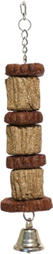 Je kunt van de hanger een voederspel maken door stukjes fruit of groente tussen de blokjes en schijven te verstoppen. De blokjes en schijven zijn gemaakt van eetbaar hout, alfalfa en groente-extracten. Het product bevat geen honing en is behalve voor knaagdieren, ook geschikt voor kleine parkieten en papegaaien. Onderaan de Hide ’n Treat Chain zit nog een belletje vast.