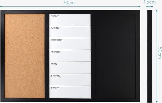 Dit 3-in-1 bord van Navaris bestaat uit een kurken prikbord, een magnetisch whiteboard en een magnetisch krijtbord. Je kunt er dus zowel op schrijven als dingen ophangen met magneetjes en punaises.
