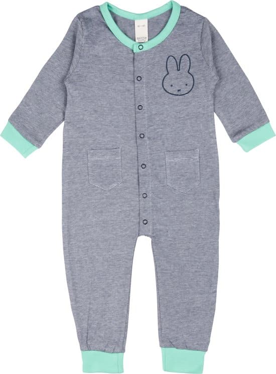 Deze leuke jongens Nijntje onesie pyjama heeft een handige drukknoop voorsluiting. Het boxpakje heeft fris groen gekleurde elastische boorden aan de mouwen en de pijpen. Het boxpakje pyjama is gemaakt van een zachte katoenen stof en heeft een smal blauw met wit streepje. De pyjama heeft twee steekzakjes en een nijntje print voor.