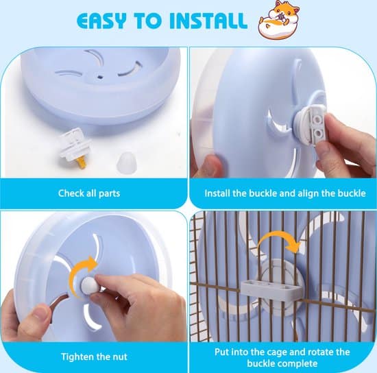 De stille hamsterwielen kunnen eenvoudig aan de zijkant van de kooi worden geïnstalleerd of met de standaard worden gebruikt (standaard niet meegeleverd).