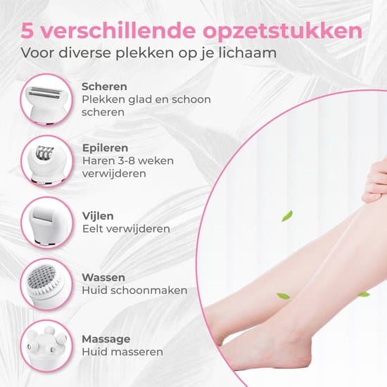 Verlang je naar een geavanceerde oplossing voor hinderlijke haargroei en huidverzorging? Dan is onze 5-in-1 Gezichts- en Lichaamsepilator precies wat je zoekt. Of het nu gaat om je gezicht, lichaam, of beide, ons eppileerapparaat voor dames is de perfecte combinatie tussen functionaliteit en comfort.
