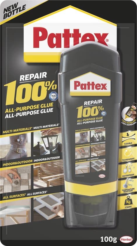 Pattex 100% is een oplosmiddelvrije, transparante en vloeibare, op polymeer gebaseerde extreem sterke allround lijm. Ideaal voor alle reparaties, doe-het-zelf en constructie werkzaamheden in en om het huis. Bestand tegen extreme situaties, zoals veroudering, weers- en waterbestendig, temperaturen van -50°C tot +80°C en vibratie en schokken.