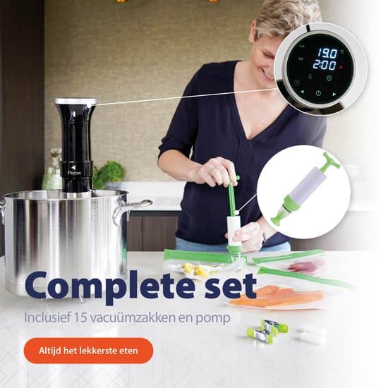 - Inhoud: 1x Sous Vide Stick; 1x Handleiding; 1x Kookboek; 15x Vacuümzakken; 2x Clips; 4x Knijpers; 1x Handpomp
