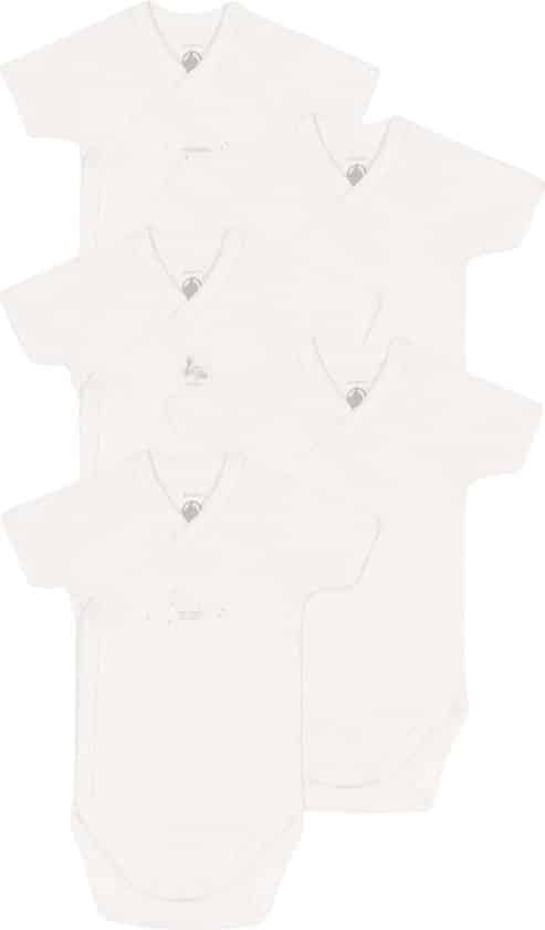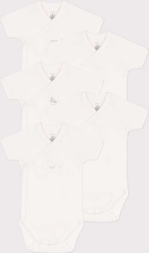 Set met 5 overslagbody’s met korte mouwen van ribstof, de typische stof van Petit Bateau. De wijde opening maakt de overslagbody perfect voor pasgeboren kinderen. Zo hoeft u niet allerlei handelingen te doen om uw baby te verschonen.Drukknoopsluiting aan de voorzijde en tussen de beentjes. Katoen afkomstig uit biologische landbouw die een respectvolle cultuur van de grond zonder ggo’s garandeert. Door dit katoen aan te bieden beperkt Petit Bateau zijn impact op de planeet. Product met label STANDAARD 100 by OEKO-TEX ®, CQ 746/3, IFTH, die respect voor de huid garandeert.