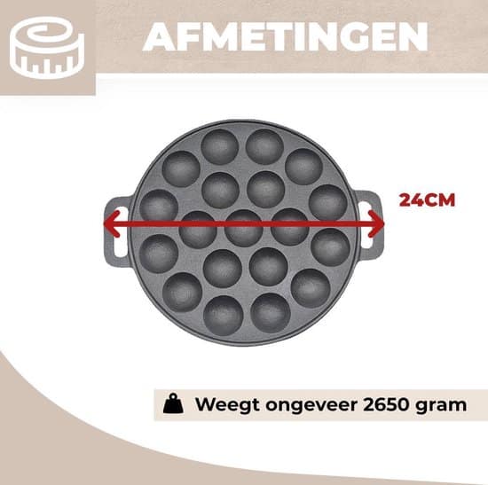 De pan is gemaakt van gietijzer, wat ontzettend makkelijk schoongemaakt kan worden na gebruik. Ook blijven de poffertjes na het invetten of insprayen niet aan de pan plakken.