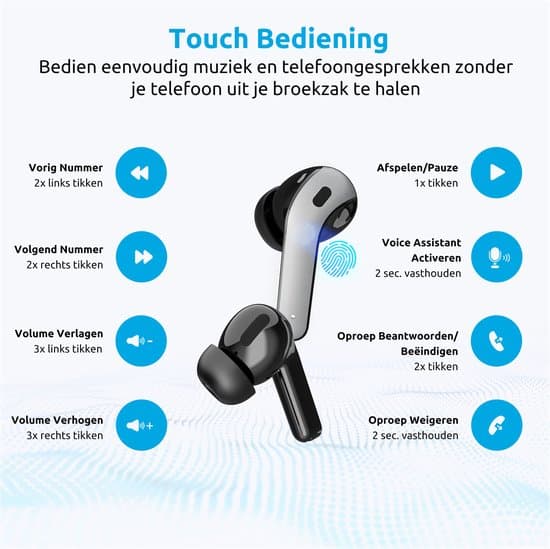 De oordopjes zijn uitgerust met touch bediening. Hiermee kun je muziek en telefoongesprekken gemakkelijk bedienen door met je vingers op de oordopjes te tikken. Dit betekent dat je je telefoon niet eens meer uit je broekzak hoeft te halen om deze te bedienen! Hieronder vind je alle functies van de touch bediening:
