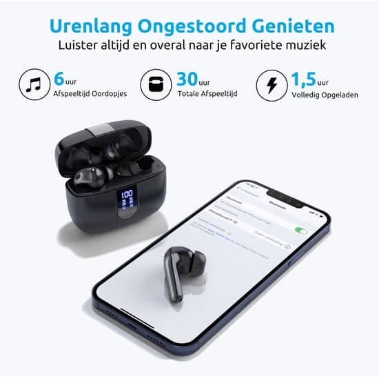 - Totale afspeeltijd inclusief oplaadcase: 30 uur