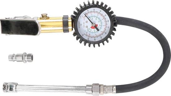 - Bandenpomp luchtpistool met een manometer (49 mm doorsnede), geschikt voor het oppompen van autobanden. De manometer is met rubber beschermd om beschadiging te voorkomen. Het blaaspistool is voorzien van een flexibele slang (ca. 340 mm). Middels de universele 1/4″ aansluiting kan het luchtpistool worden aangesloten op vrijwel alle type luchtcompressors.