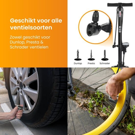 Zoek je een stevige pomp die overal voor te gebruiken is? Dan is deze staande fietspomp van R2B echt iets voor jou! Hij is super voor je fiets, scooter, auto, sportballen en zelfs je luchtbed. Deze pomp past op alle soorten ventielen, zowel Schrader (de dikke) als Presta & Dunlop (de dunne). Daarnaast kan deze pomp heel sterk oppompen, tot wel 11 bar/160 PSI. Ook heeft hij een handig lock-systeem waarmee hij goed en stevig vastzit. Stevig, nauwkeurig en voor van alles te gebruiken – een topkeuze voor iedereen die fietst, rijdt of graag aan balsport doet!