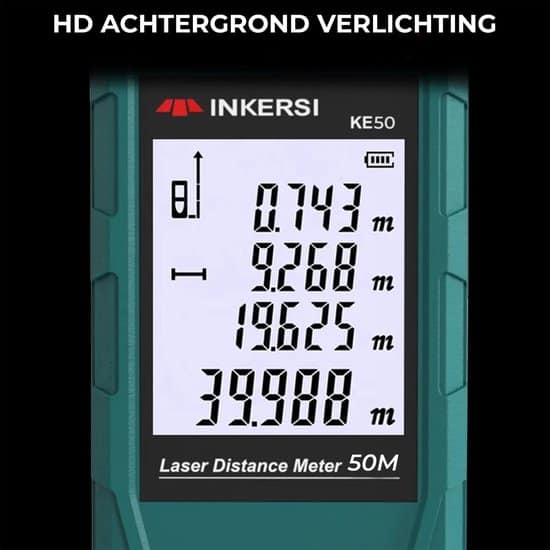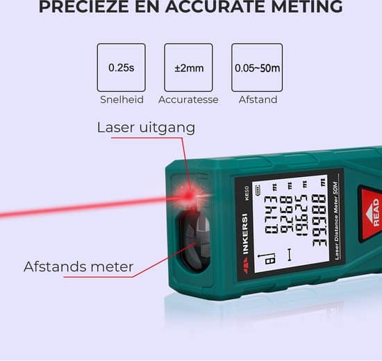 Het meten van dingen of ruimten kost meestal heel wat tijd. Je hoeft nu niet langer meer te Hannessen met je rolmaat of meetlint. Deze lasermeter gebruikt een laser om de afstand binnen enkele seconden te meten. Zet het apparaatje bijvoorbeeld op de grond in de huiskamer. Wanneer je de lasermeter inschakelt, zal de afstand van de grond tot het plafond worden gemeten. Het is erg handig en efficiënt wanneer je snel even wat wilt opmeten tussen het klussen door. Bovendien is de lasermeter zeer nauwkeurig. Deze lasermeter heeft 4 eenheden : Meter , Inch , voet , Voet+inch. Hierbij ook nog eens 6 verschillende weergaveresultaten als afstand, oppervlakte, volume, pythagoras (indirecte meting), continue meting, optellen en aftrekken.