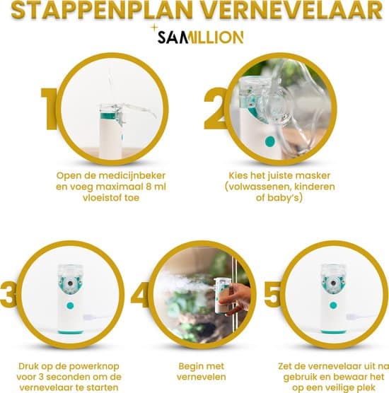 De vernevelaar van Samillion is te gebruiken voor elke leeftijd, dus voor zowel volwassenen, kinderen en baby’s. Je krijgt twee maskers meegeleverd één voor kinderen/volwassenen en één masker speciaal voor baby’s gemaakt. Ook krijgt je twee mondstukken meegeleverd. De vernevelaar van Samillion is dus voor iedereen!