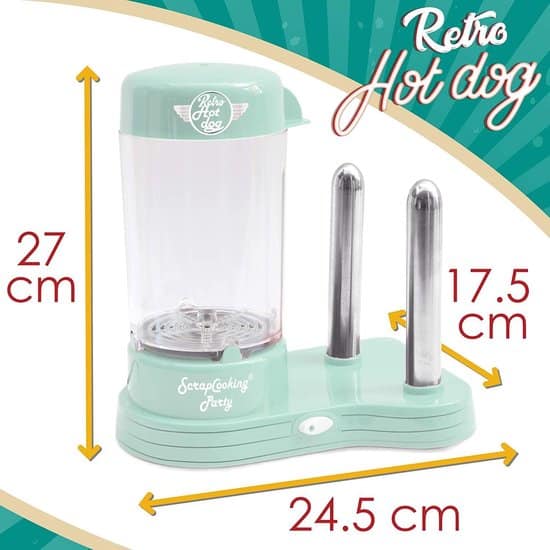 - Een vintage look – met zijn retro design en de kleurrijke verpakking is deze hot-dog-machine een geweldig cadeau-idee en een geweldig apparaat in je keuken of eettafel. Je kunt je gasten heel eenvoudig met deze eenvoudige en snelle snacks voeden. Ideaal voor verjaardagen, hotdog-feestjes en barbecuefeestjes met vrienden.
