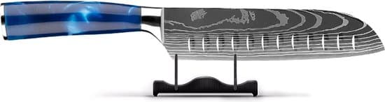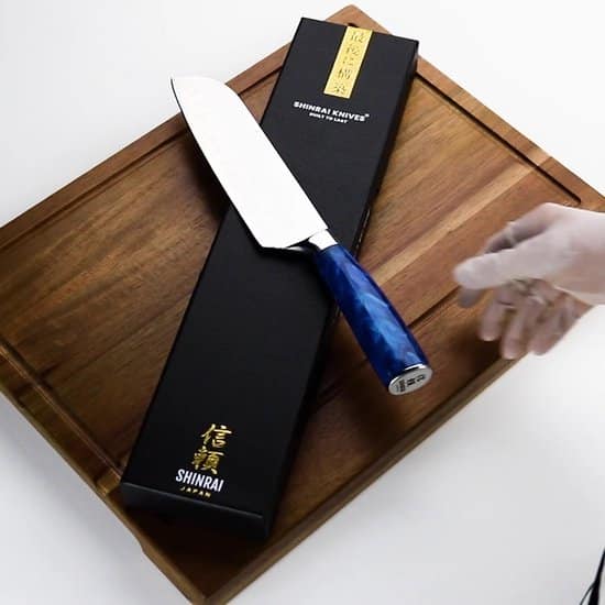Het Japanse Damast Print Series Epoxy Sapphire – Santoku mes (18cm) van Shinrai Japan is een multifunctioneel Japans mes. Een santoku mes kun je namelijk groente, vlees en vis mee snijden, hakken en trancheren. Een voordeel van een santoku mes is dat ze lichter zijn dan de meeste Europese keukenmessen en daarom ook iets beter hanteerbaar zijn. Hierdoor blijft het aangenaam om mee te snijden, ook voor de kok met lange dagen.