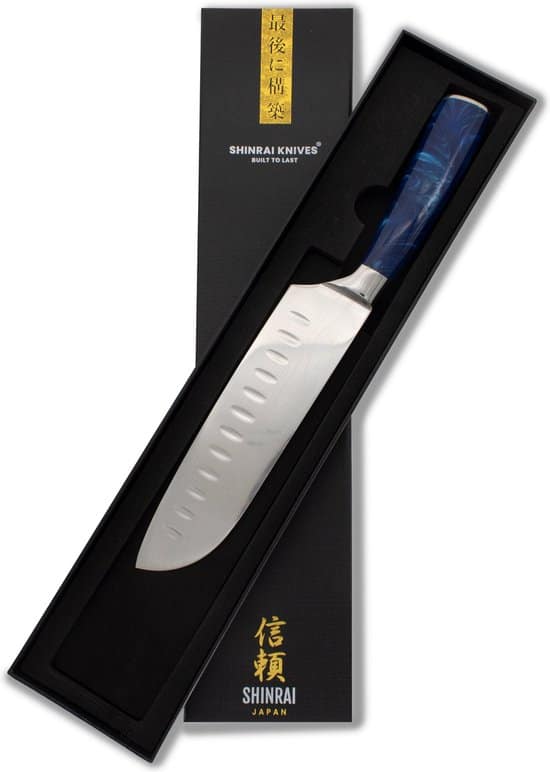 - Vlijmscherp Santoku mes met een lemmet van 18 centimeter.